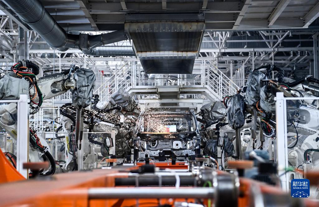 2022年10月17日,在吉林長春中國第一汽車集團(tuán)有限公司紅旗繁榮工廠焊裝車間內(nèi),焊裝機(jī)器人在生產(chǎn)線上焊接車身。新華社記者 顏麟蘊(yùn) 攝