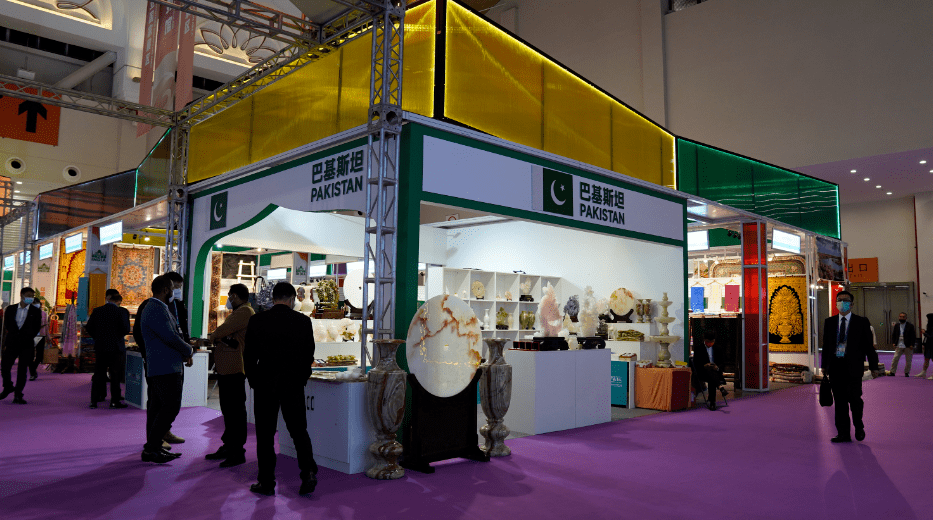 阿富汗手工羊毛地毯、克什米爾羊絨圍巾、加納的非洲鼓、巴基斯坦的花梨木工藝品……境外館內充滿了異域風情,外國參展商們熱情地向顧客推介他們的商品。
