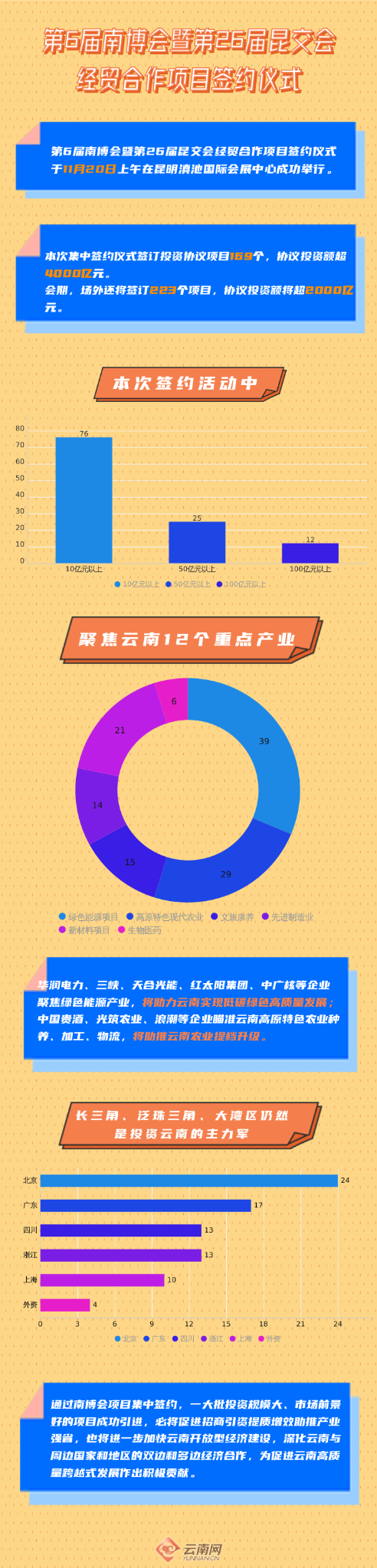 第6屆南博會暨第26屆昆交會經貿合作項目簽約儀式于11月20日上午在昆明滇池國際會展中心成功舉行。本次集中簽約儀式簽訂投資協議項目169個,協議投資額超4000億元。會期,場外還將簽訂223個項目,協議投資額將超2000億元。