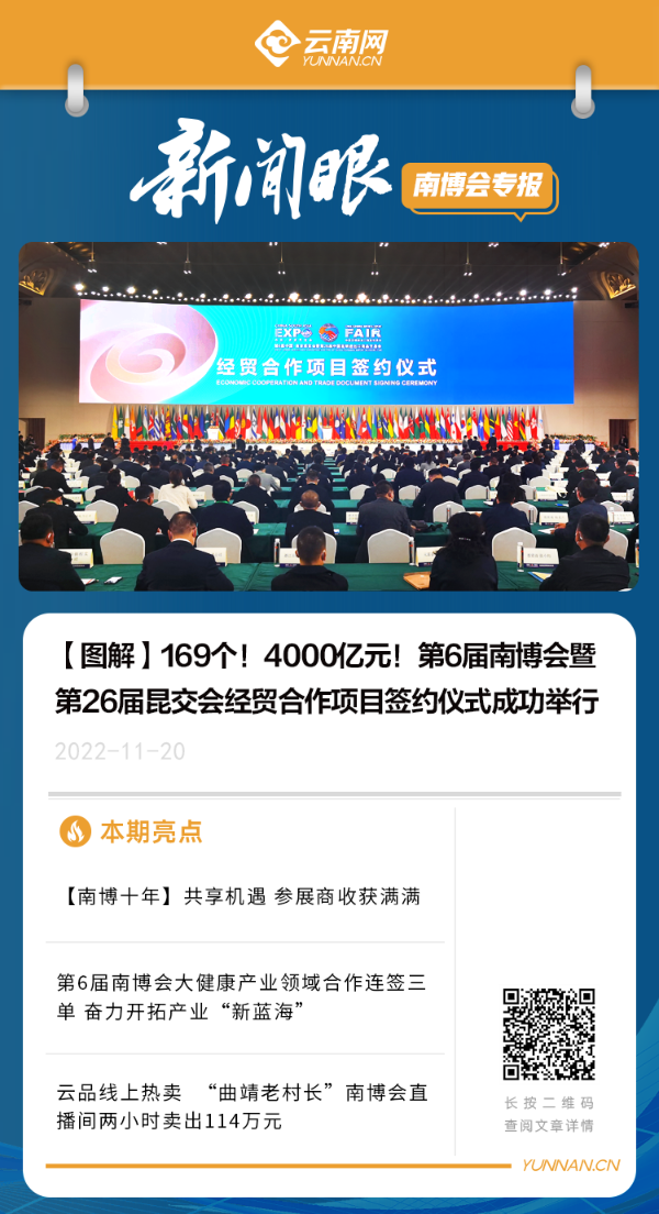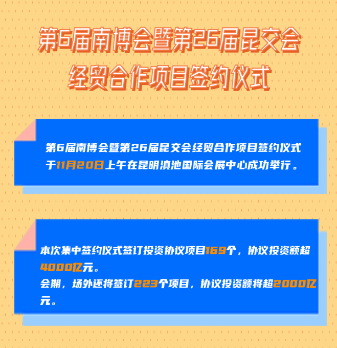 第6屆南博會(huì)暨第26屆昆交會(huì)經(jīng)貿(mào)合作項(xiàng)目簽約儀式于11月20日上午在昆明滇池國(guó)際會(huì)展中心成功舉行。本次集中簽約儀式簽訂投資協(xié)議項(xiàng)目169個(gè),協(xié)議投資額超4000億元。會(huì)期,場(chǎng)外還將簽訂223個(gè)項(xiàng)目,協(xié)議投資額將超2000億元。》》》點(diǎn)擊查看完整圖解