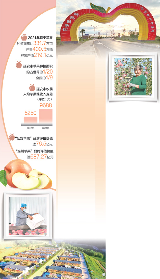 2012年至2021年,延安蘋(píng)果產(chǎn)值增長(zhǎng)最快,年均增長(zhǎng)14.3億元。靠著這顆奮斗果,10年間,全市農(nóng)民人均純收入從5250元增加到9688元。
