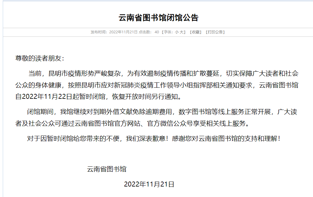 昆明信息港 記者劉欣彤 記者從云南省圖書館了解到,按照昆明市應對新冠肺炎疫情工作領導小組指揮部相關通知要求,云南省圖書館將自2022年11月22日起暫時閉館,恢復開放時間另行通知。