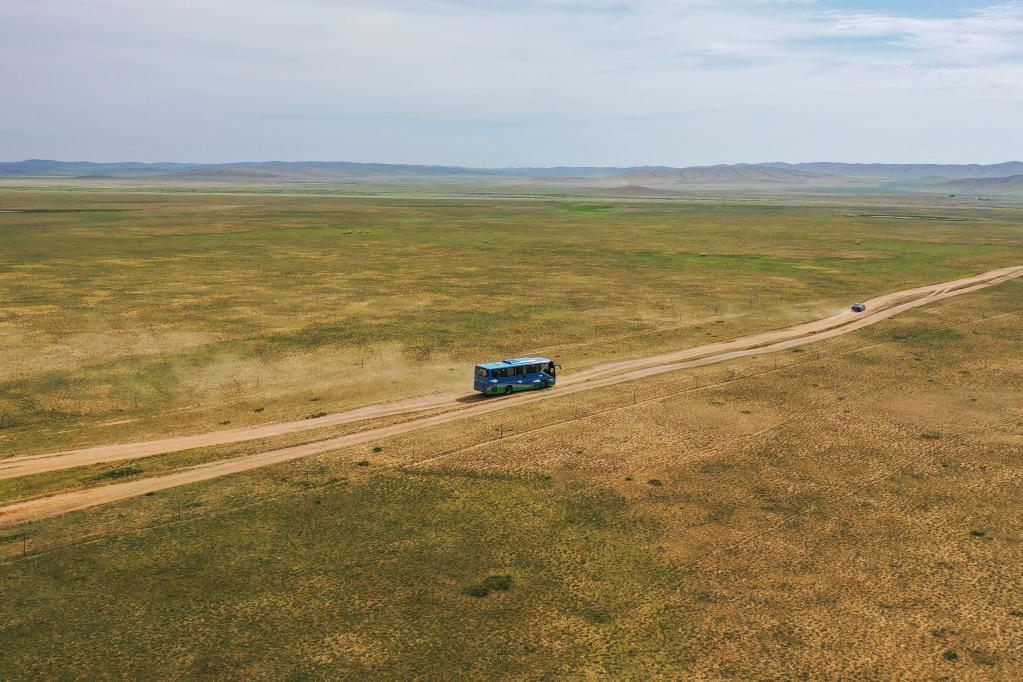 不到8點(diǎn)鐘,院里傳來(lái)發(fā)動(dòng)機(jī)的轟鳴聲,烏蘭牧騎的大巴車出發(fā)了,迎著朝陽(yáng)駛?cè)霃V袤的草原中。