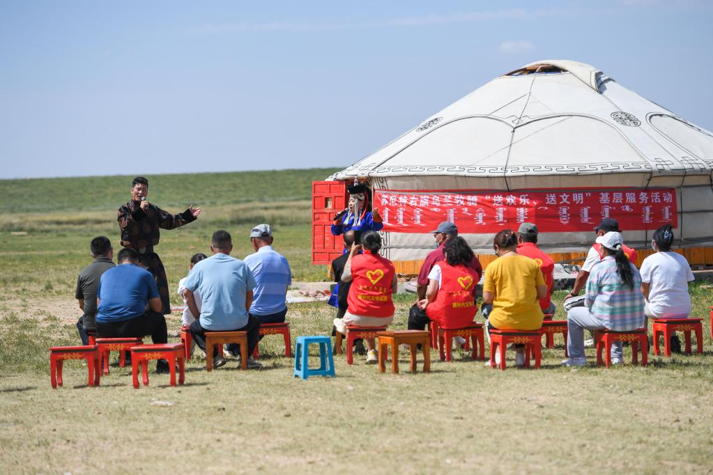 每次演出前,烏蘭牧騎隊(duì)員會(huì)向牧民群眾宣講防疫、防火、畜牧業(yè)生產(chǎn)等知識(shí),也常幫牧民打草、清理羊圈。