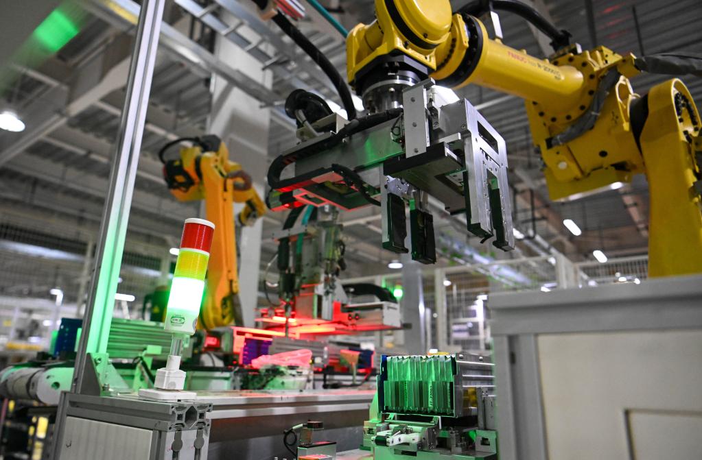 2022年7月25日,在天津榮盛盟固利新能源科技有限公司模組車間,工業(yè)機(jī)器人在生產(chǎn)線上搬運(yùn)動(dòng)力電池模組。新華社記者 孫凡越 攝