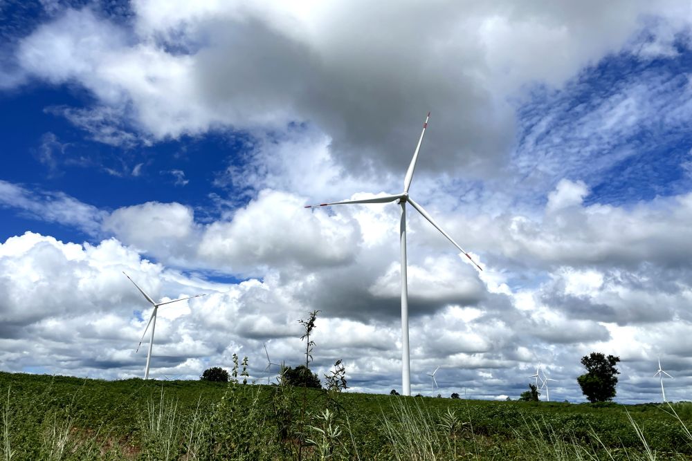 這是2022年10月4日在泰國(guó)猜也蓬府拍攝的由中國(guó)金風(fēng)科技提供的風(fēng)力發(fā)電機(jī)。新華社記者 宋宇 攝