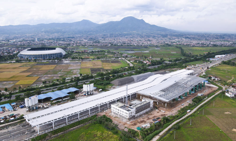 這是2022年10月27日在印度尼西亞萬(wàn)隆拍攝的建設(shè)中的雅萬(wàn)高鐵德卡魯爾車站(無(wú)人機(jī)照片)。新華社記者 徐欽 攝