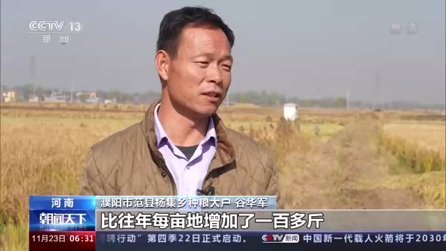 河南省濮陽市范縣楊集鄉(xiāng)種糧大戶 谷華軍:今年畝產量達到一千三百斤左右,比往年每畝地增加了一百多斤。
