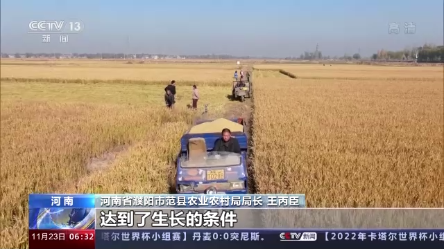 這兩天,河南省濮陽市范縣的18萬畝水稻收獲接近尾聲,在楊集鄉(xiāng)種糧大戶谷華軍的稻田里,兩臺收割機正在進行最后的搶收。