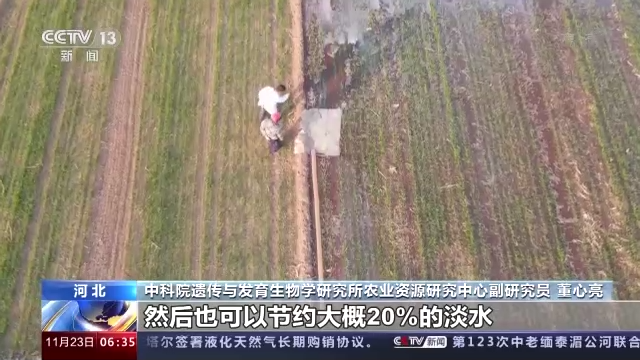 中科院遺傳與發(fā)育生物學研究所農業(yè)資源研究中心副研究員 董心亮:我們發(fā)現在小麥的拔節(jié)期,采用一次咸水代替淡水進行灌溉,既不影響小麥的正常發(fā)育和產量,然后也可以節(jié)約大概20%的淡水,這項技術目前已經在環(huán)渤海地區(qū)推廣達到100多萬畝。