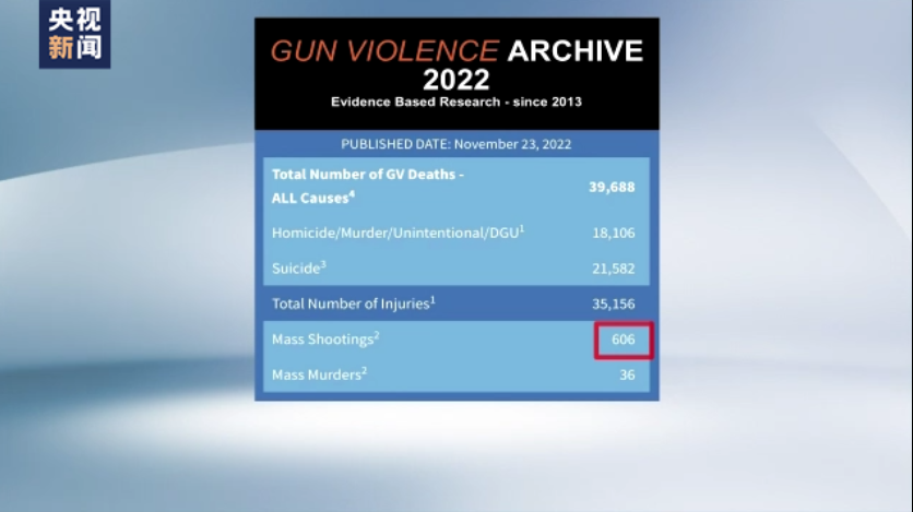 據(jù)美國(guó)“槍支暴力檔案”網(wǎng)站的統(tǒng)計(jì),截至11月23日,全美今年發(fā)生死傷達(dá)到4人及以上的大規(guī)模槍擊事件已達(dá)606起,這是美國(guó)連續(xù)第3年大規(guī)模槍擊案數(shù)量突破600起。