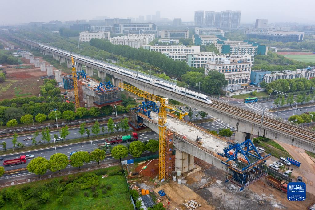 中鐵四局四公司的工程人員在江蘇南沿江城際鐵路站前Ⅰ標(biāo)工程跨天元東路連續(xù)梁施工點(diǎn)施工作業(yè)(2021年4月27日攝,無人機(jī)照片)。新華社記者 李博 攝
