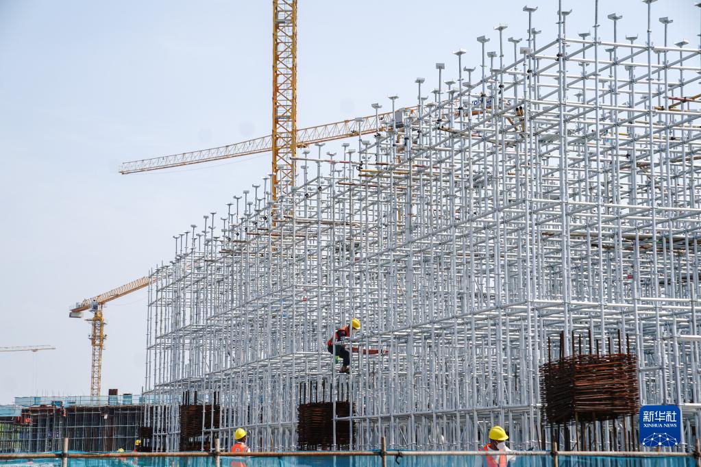 中建三局華東公司上海分公司的工人在位于上海的華為青浦研發(fā)中心項(xiàng)目工地上作業(yè)(2022年6月15日攝)。新華社記者 丁汀 攝