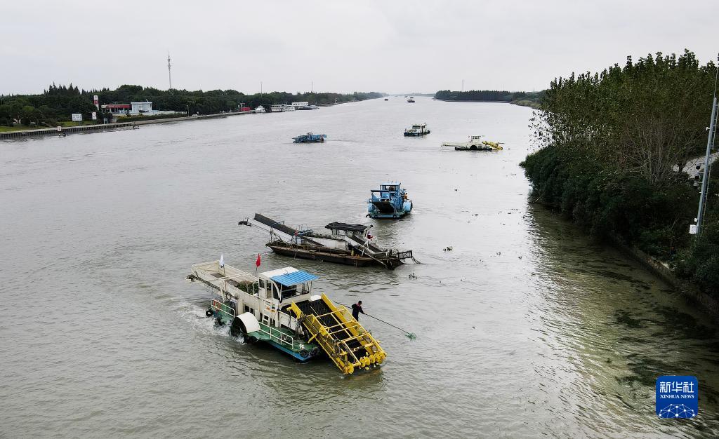 蘇浙滬三地的保潔船在太浦河水域聯(lián)合清理水面浮游植物(2020年10月15日攝,無人機(jī)照片)。當(dāng)日,來自蘇州市吳江區(qū)、上海市青浦區(qū)和嘉興市嘉善縣的三名河長(zhǎng)在位于長(zhǎng)三角生態(tài)綠色一體化發(fā)展示范區(qū)的蘇浙滬交界水域太浦河流域附近開展聯(lián)合巡河活動(dòng)。新華社記者 方喆 攝