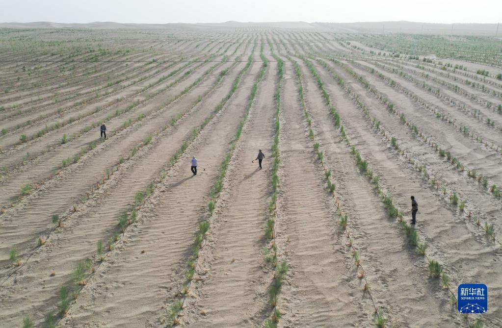 在新疆且末縣,老兵們和聘請的當?shù)剞r(nóng)民查看在沙地里種植的梭梭的生長情況(無人機照片,2022年7月4日攝)。新華社記者李響/攝