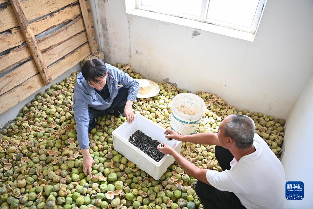 在新疆且末縣,張選忠(左)、田來群在沙漠里一處水泵倉庫中將采摘好的文冠果去殼剝籽(2022年7月4日攝)。新華社記者李響/攝