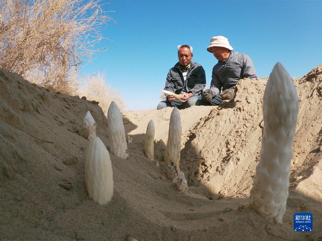 在新疆且末縣,田野在采挖沙地里種植的大蕓(2022年3月31日攝)。新華社發(fā)(蘇鑫/攝)