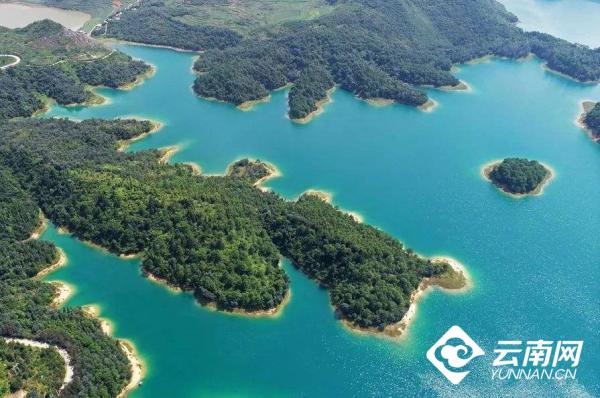從空中俯瞰,湖岸線蜿蜒曲折,青山疊翠,群山環(huán)抱藍(lán)湖,藍(lán)湖掩映綠島,水中兩座大島形似雙龍擺尾,守望璀璨的明珠。島上松柏濃蔭蔽日,湖光若隱若現(xiàn),一湖浩渺的藍(lán),與四周一片蔥蘢的綠融為一體,旖旎風(fēng)光如幻境般恬靜優(yōu)美,美不勝收。