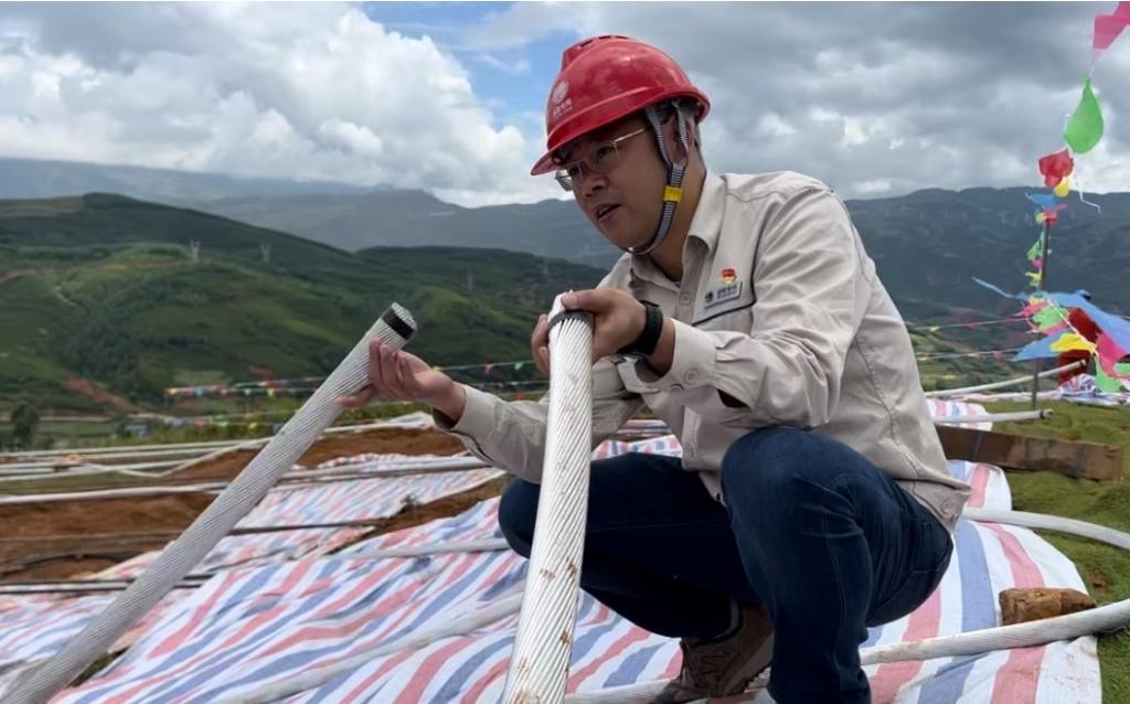 在白浙線特高壓直流輸電線路工程施工現(xiàn)場(chǎng),國(guó)網(wǎng)四川電力送變電建設(shè)有限公司施工項(xiàng)目經(jīng)理王培正在介紹線纜情況。新華社發(fā)