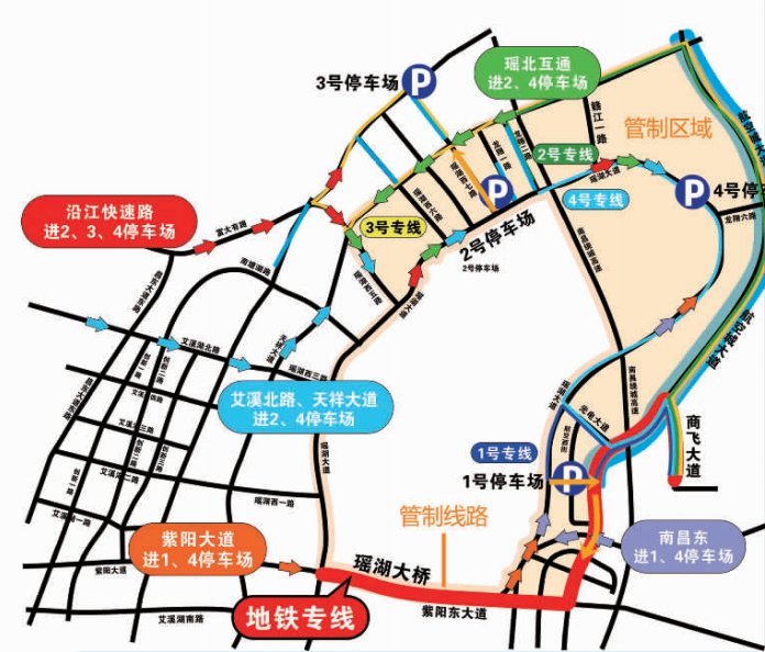 2、瑤湖西六路、瑤湖西七路的天祥北大道口至沿江快速路口段、龍翔一路(宏光二路)的瑤湖大道口至規(guī)劃路口段、龍翔二路(宏光一路)禁止機(jī)動車輛向沿江北快速路通行(“大會”公交接駁車輛除外);