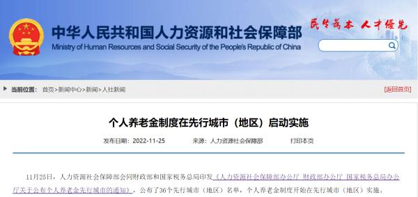 11月25日,人社部網(wǎng)站發(fā)布的個(gè)人養(yǎng)老金制度先行啟動(dòng)實(shí)施的信息。