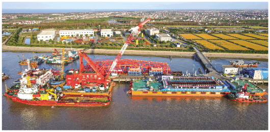 11月24日,空中俯瞰停靠在橫沙碼頭的“奮力”輪(右)(無人機(jī)照片)。新華社記者 方喆 攝