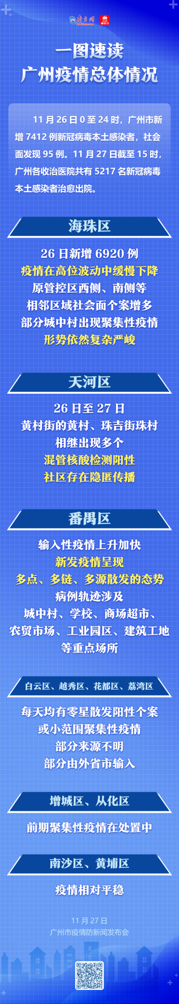 白云區(qū)、越秀區(qū)、花都區(qū)、荔灣區(qū)每天均有零星散發(fā)陽性個案或小范圍聚集性疫情,部分來源不明,部分由外省市輸入,正在處置中。增城、從化前期聚集性疫情也在處置中,南沙、黃埔疫情相對平穩(wěn)。