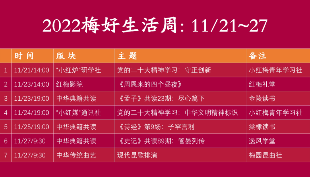 南京市玄武區(qū)“小紅梅”黨建陣地每周發(fā)布活動(dòng)預(yù)告。圖為2022年11月21日至27日學(xué)習(xí)活動(dòng)的時(shí)間和主題。