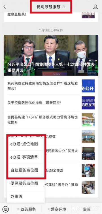 方式1:通過(guò)“昆明政務(wù)服務(wù)”微信公眾號(hào),查詢(xún)?nèi)幸惑w化政務(wù)服務(wù)自助終端分布位置圖及可辦理事項(xiàng)。
