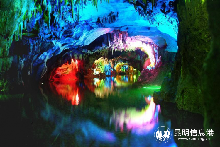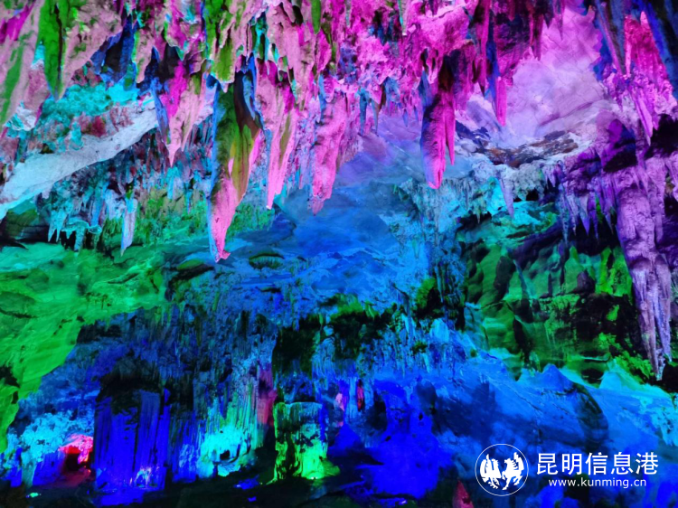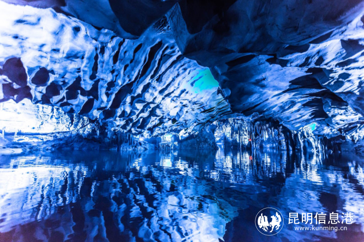 乘船進(jìn)入地下暗河——「玉筍河」,河面平靜,清澈見底。藍(lán)色的燈光打在形狀各異的鐘乳石上,仿佛穿越在藍(lán)色的冰川世界。熱情大方的彝族導(dǎo)游阿依妹,為我們唱起了歌來“阿廬是一個(gè)美麗的地方,阿廬是一個(gè)美麗的地方,那里有古老的溶洞,那里有人間的天堂......”在洞內(nèi)天然回響的烘托下,歌聲顯得格外悠揚(yáng)清澈;偶爾用手敲打河岸邊的石鐘乳,也會(huì)發(fā)出靈動(dòng)的手鼓樂器聲......短短800m的旅程,再加上奇迷絢爛的燈光,仿佛經(jīng)歷了一場音樂會(huì)。
