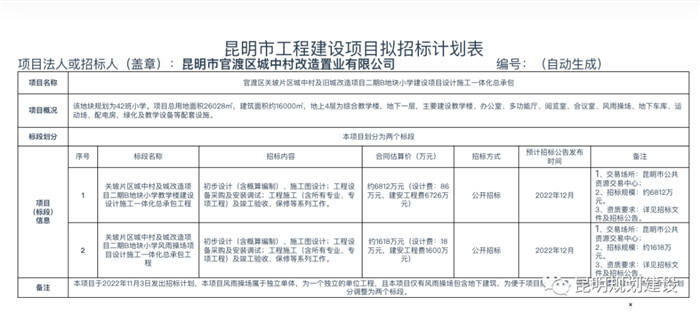 值得一提的是,11月30日云南省公共資源交易信息網(wǎng)亦發(fā)布《官渡區(qū)關(guān)坡片區(qū)城中村及舊城改造項(xiàng)目二期B地塊小學(xué)建設(shè)項(xiàng)目設(shè)計(jì)施工一體化總承包》招標(biāo)計(jì)劃,該地塊規(guī)劃的42班小學(xué)即將動(dòng)工,預(yù)計(jì)投資8400萬(wàn)元。