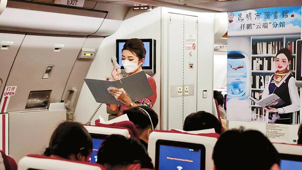 近日,昆明市圖書館“云端”分館在祥鵬航空8L9987昆明—北京航班上首次與旅客見面,這也是全國(guó)第一家直接建在飛機(jī)上的“云端”圖書館。