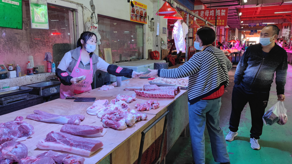 消費(fèi)者在四川省三臺縣的農(nóng)貿(mào)市場買豬肉。新華社記者袁波 攝