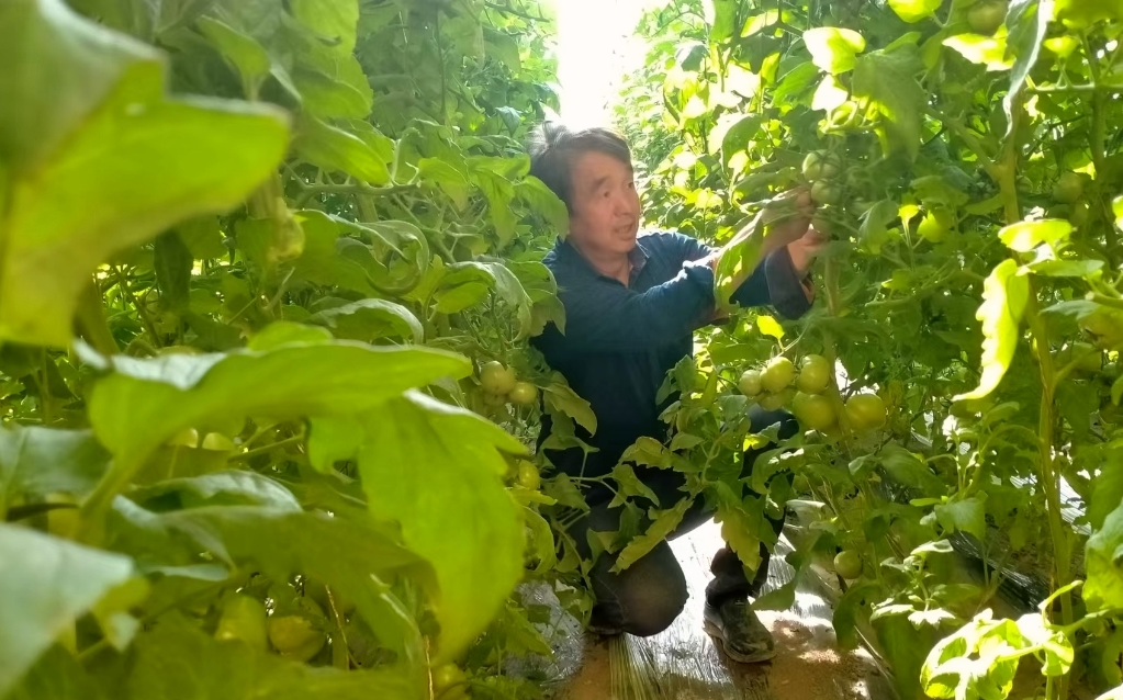11月23日,在蘭州市榆中縣李家莊村,村民陳吉寶正在自家溫室大棚打理西紅柿。(受訪者供圖)