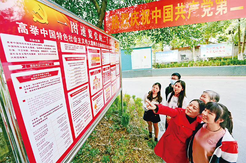 圖為2022年10月18日,重慶市萬盛經(jīng)開區(qū)東林街道清溪橋社區(qū),剛剛制作好的黨的二十大宣傳展板吸引了不少居民駐足閱覽,熱議并學(xué)習(xí)黨的二十大報(bào)告。 視覺中國 王瀘州/攝