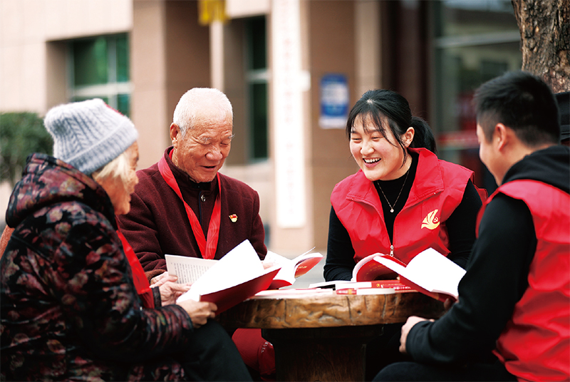 圖為2022年11月18日,山東省臨沂市郯城縣郯城街道“90后”青年黨員志愿者與龍泉社區(qū)“40后”老黨員一起學(xué)習(xí)黨的二十大精神。 人民圖片 張春雷/攝