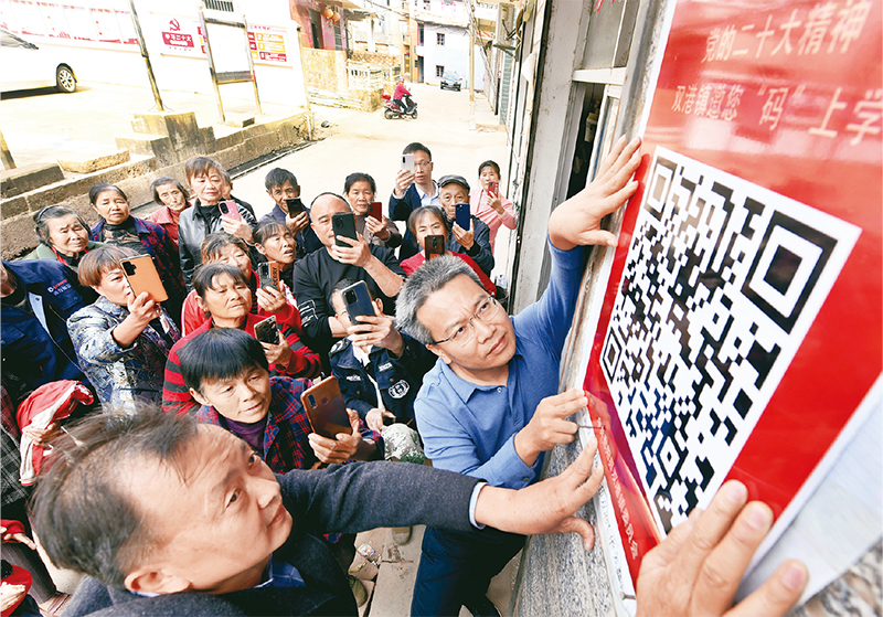 圖為2022年11月13日,江西省鄱陽縣雙港鎮(zhèn)黨員干部將宣講黨的二十大精神的二維碼貼在村頭,吸引不少村民前來掃碼學(xué)習(xí)了解有關(guān)知識。 中新社發(fā) 卓忠偉/攝