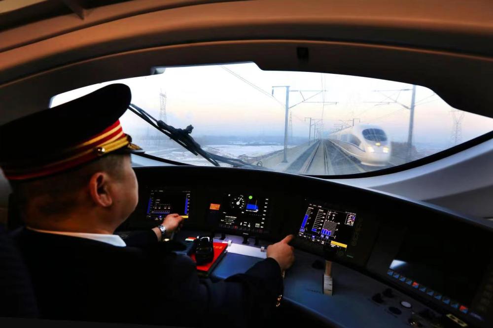 司機(jī)駕駛高鐵列車行駛在哈大高鐵線路上。(圖片由中國鐵路沈陽局集團(tuán)有限公司提供)