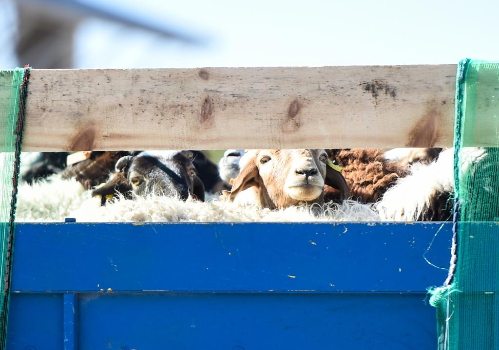 2020年10月22日在內(nèi)蒙古二連浩特口岸拍攝的蒙古國(guó)捐贈(zèng)的羊。