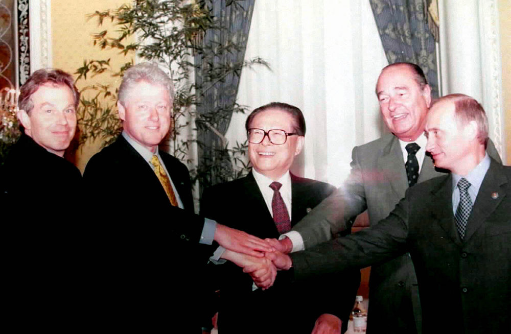 2000年9月7日,由中國(guó)倡議的聯(lián)合國(guó)安理會(huì)五個(gè)常任理事國(guó)首腦會(huì)議在紐約舉行。江澤民同志(中)同法國(guó)總統(tǒng)希拉克(右二)、俄羅斯總統(tǒng)普京(右一)、英國(guó)首相布萊爾(左一)、美國(guó)總統(tǒng)克林頓(左二)握手合影。新華社發(fā)