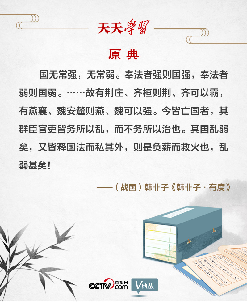 韓非子認(rèn)為,各國皆有法度,關(guān)鍵是能否秉公執(zhí)法。他以荊莊王(楚莊王)、齊桓公、燕襄王、魏安釐(xī)王為例,說明君主若能堅(jiān)決推行法治,國家就能強(qiáng)盛?!敖窠酝鰢?,其群臣官吏皆務(wù)所以亂,而不務(wù)所以治也。其國亂弱矣,又皆釋國法而私其外,則是負(fù)薪而救火也,亂弱甚矣!”意思是,現(xiàn)在這些國家都已衰落,是由于他們的大臣官吏,都去做使國家亂而不是使國家治的事情。國家已經(jīng)衰落,又都舍棄國法而營求私利,如同負(fù)薪救火,國家就更衰落了。