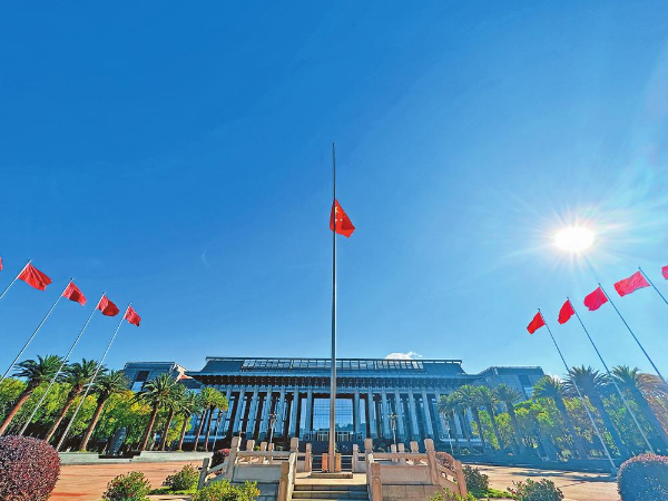 12月6日上午,我省各地各族干部群眾收聽收看江澤民同志追悼大會,深切悼念江澤民同志,緬懷其偉大光輝的一生。這是云南海埂會堂下半旗志哀。記者王毅/攝 ? ? ?