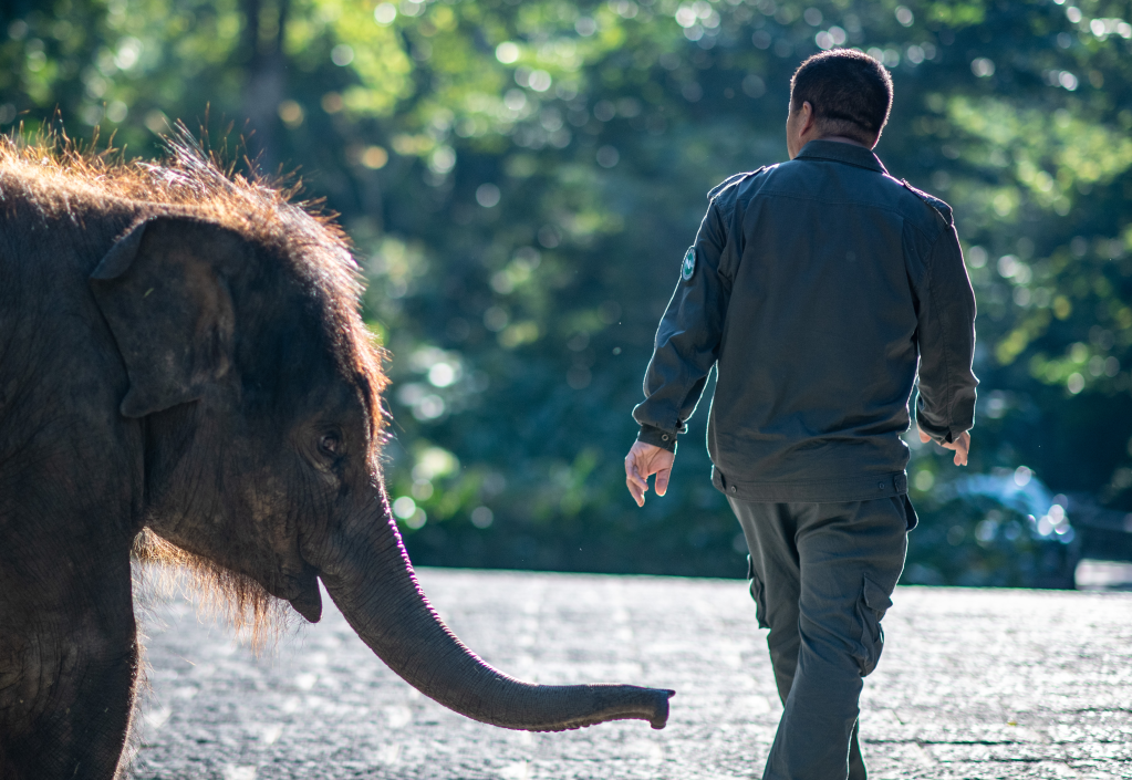 救助回來的大象每天都會在專職馴養(yǎng)員的陪伴下在森林里自由活動,學(xué)習(xí)辨認(rèn)和取食天然植物,練習(xí)野外生存技能,進(jìn)行野外生存訓(xùn)練?!皩B汃Z養(yǎng)員就像對待自己孩子一樣照顧救助回來的野象,時間長了,不管大象還是小象,和專職馴養(yǎng)員的關(guān)系都非常融洽?!?3歲的專職馴養(yǎng)員王波已在這里工作7年,每天,他要給小象“羊妞”檢查身體,測量體溫,查看口腔和象腿,定時喂食物和水,帶它到森林中進(jìn)行野外生存訓(xùn)練。