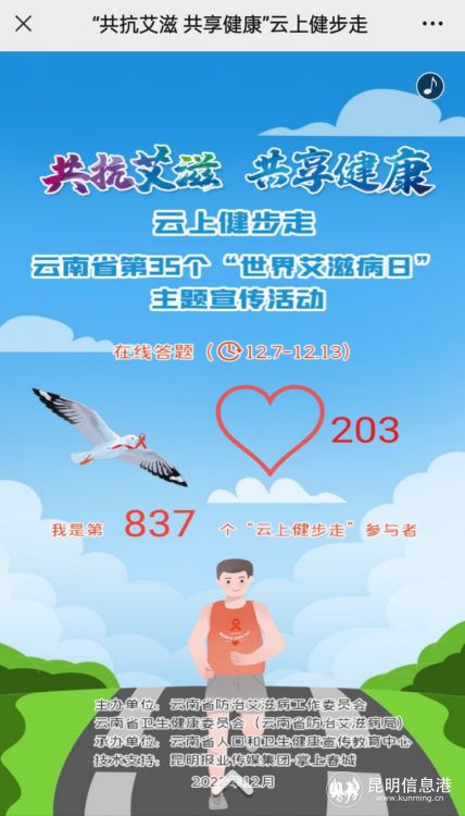 本次云南省第35個世界艾滋病日主題宣傳活動,緊扣主題,啟動了云上健步走——防艾知識在線答題活動。應(yīng)用掌上春城互動答題平臺系統(tǒng),圍繞世界艾滋病日及防艾相關(guān)知識進行題目創(chuàng)意,題目內(nèi)容充分結(jié)合市民日常生活,融入案例、生活場景等,提升答題趣味性。廣大市民通過掃描二維碼即可參與,在手機上完成健步走的同時參與答題,答對10道及以上視為完賽,即可填寫信息獲得抽獎機會。主辦方為大家準備了500份跑者臂包和紀念水杯等精美的禮品,該活動從12月7日起持續(xù)7天。