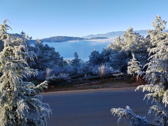 霧凇,其實也是霜的一種,是由冰晶在溫度低于冰點以下的物體上形成的白色不透明粒狀結構沉積物。其形成過程是:當過冷水霧(溫度低于零度)碰撞到同樣低于凍結溫度的物體時,便會形成霧凇。