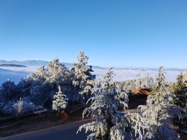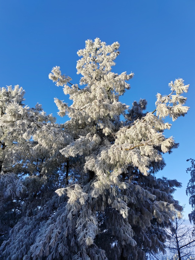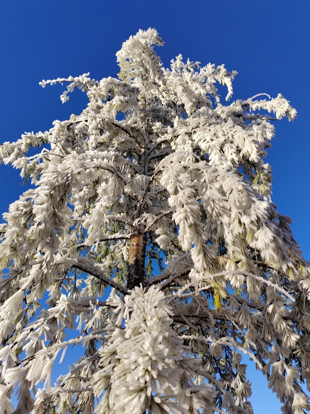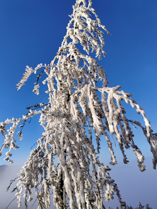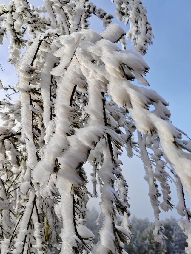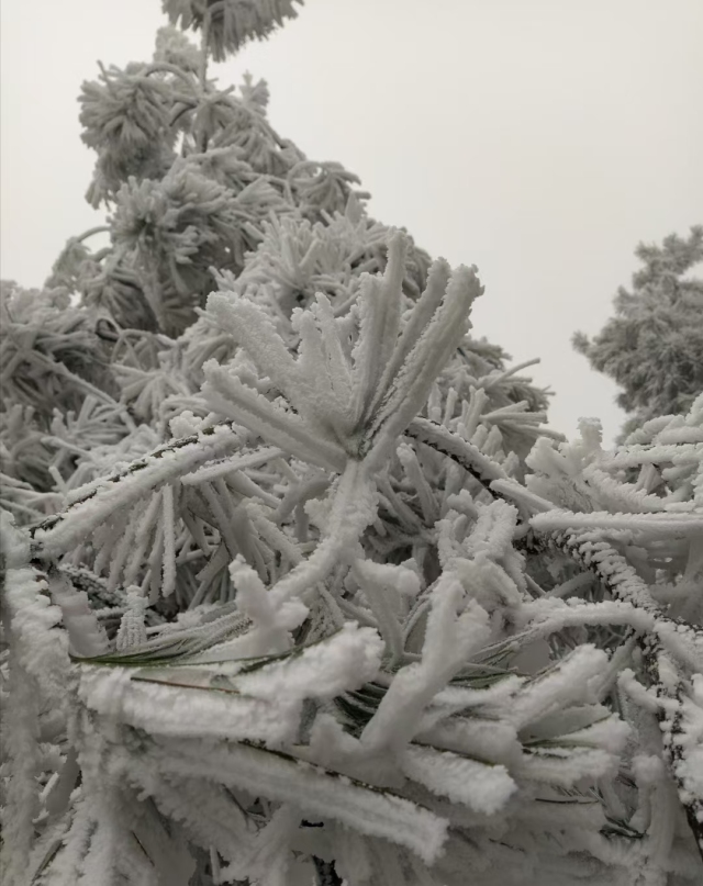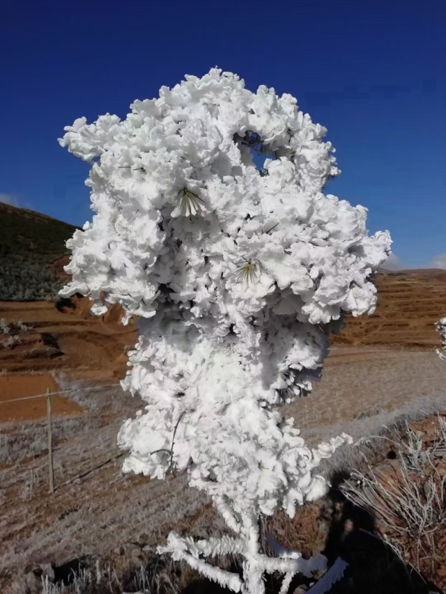據(jù)科普資料記載:霧凇,俗稱冰花、樹掛等,是低溫時空氣中水汽直接凝華或過冷霧滴直接凍結在物體上的乳白色冰晶沉積物。