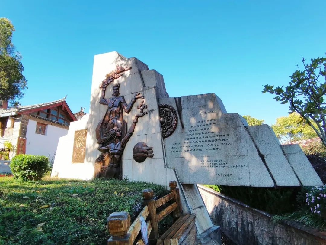 “根據(jù)《保護(hù)世界文化和自然遺產(chǎn)公約》,聯(lián)合國教科文組織世界遺產(chǎn)委員會(huì)確認(rèn)麗江古城之獨(dú)特歷史文化價(jià)值,并于一九九七年批準(zhǔn)將其作為人類文化遺產(chǎn)列入《世界遺產(chǎn)名錄》。為了人類的利益,保護(hù)麗江古城,人人有責(zé)?!痹谠颇消惤懦强?,大水車旁,一塊石碑上,“世界文化遺產(chǎn)”的標(biāo)識(shí)赫然醒目,中英兩種文字告訴世人麗江古城的“世界屬性”。