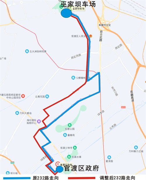 232路起終站為“巫家壩車(chē)場(chǎng)(起始站)——官渡區(qū)政府(終到站)”,優(yōu)化調(diào)整后將新增停靠“曉東村站D1口(去)、永豐村(永中路)、九門(mén)里農(nóng)貿(mào)市場(chǎng)(永中路)、海倫國(guó)際(永中路)、雅居樂(lè)中央雅府(永中路)、海德區(qū)西北門(mén)、海倫區(qū)北門(mén)、海樂(lè)城、東溝公園、銀海暢園(季宏路)、櫻花語(yǔ)小區(qū)(季宏路)(回)”等11個(gè)公交站。