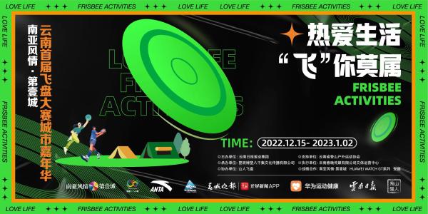 南亞風(fēng)情·第壹城“云南首屆飛盤(pán)大賽城市嘉華”由云南日?qǐng)?bào)報(bào)業(yè)集團(tuán)主辦,云南省登山協(xié)會(huì)支持,昆明博塑八千集文化傳播有限公司承辦,山人飛盤(pán)協(xié)辦,賽事全程由云南春晚傳媒有限公司文體運(yùn)營(yíng)中心執(zhí)行。同時(shí)安踏和華為運(yùn)動(dòng)健康將作為賽事獨(dú)家品牌戰(zhàn)略合作為比賽保駕護(hù)航。嘉年華將通過(guò)社交精致露營(yíng)微度假、趣玩親子互動(dòng)體驗(yàn)、各行業(yè)及網(wǎng)紅專(zhuān)場(chǎng)等形式帶來(lái)兼具觀賞性及互動(dòng)性的體驗(yàn),在2022年12月至2023年元旦假期的每個(gè)周末都有精彩活動(dòng),向昆明人散發(fā)飛盤(pán)運(yùn)動(dòng)的魅力。