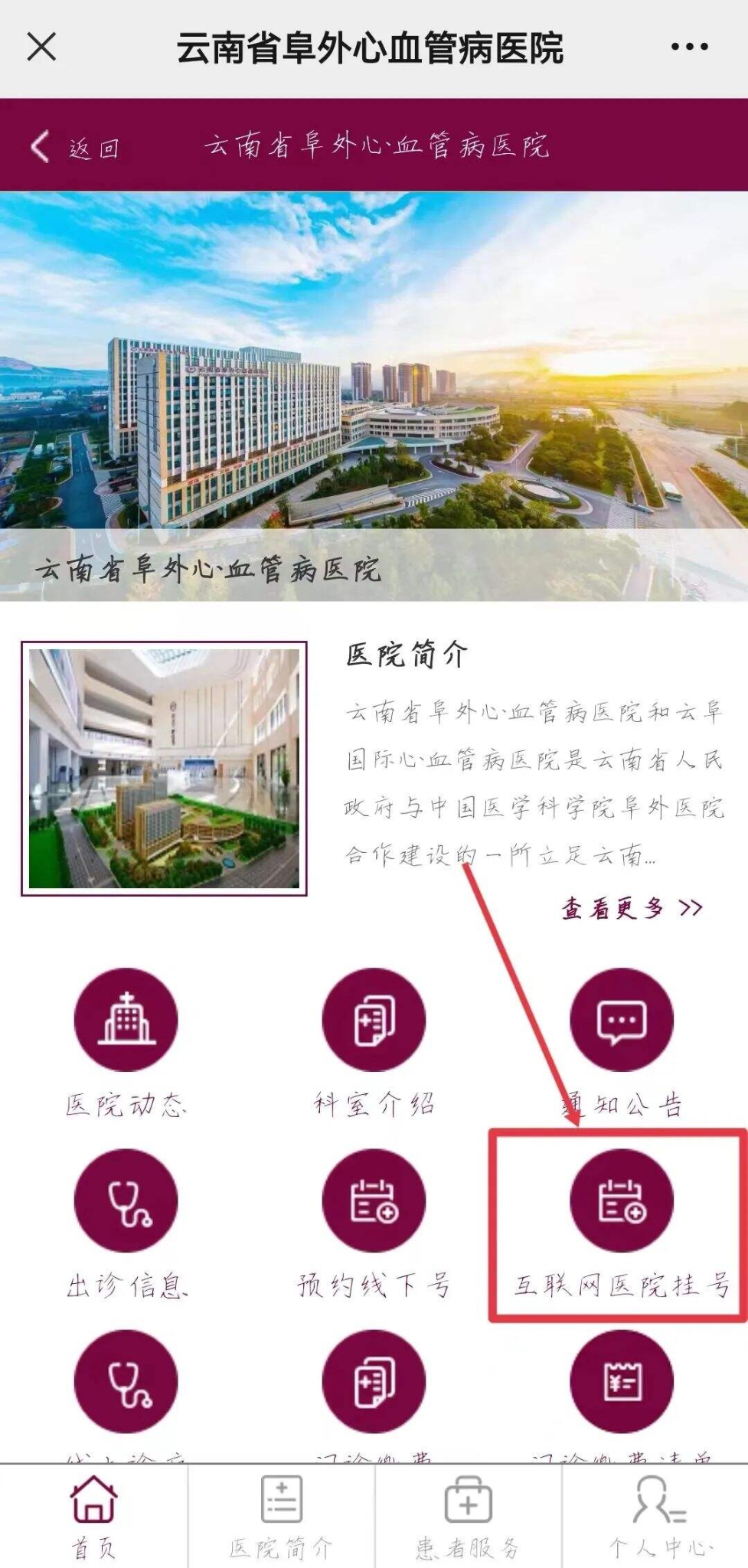 ①微信關(guān)注“云南省阜外心血管病醫(yī)院”公眾號,點擊下方“醫(yī)院首頁”一欄進入登錄頁面,醫(yī)院首頁頁面下方選擇“互聯(lián)網(wǎng)醫(yī)院掛號”。